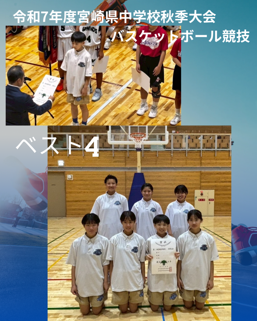 令和7年度宮崎県中学校秋季体育大会バスケットボール競技において、女子バスケットボール部はベスト4の結果となりました。 最後まで粘り強く戦い抜いた選たち。悔しい結果となりましたが、この経験を力に変えて―――――― さらなる高みを目指して、チーム一丸となって頑張ります。 大会を通してたくさんの方々に応援していただき、本当にありがとうございました。皆さんの声援が力になりました。